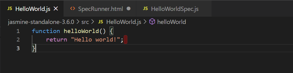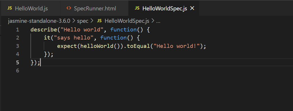 그리고 spec 폴더 안에 HelloWorldSpec.js라는 파일을 만들고 아래 코드를 입력해준다.