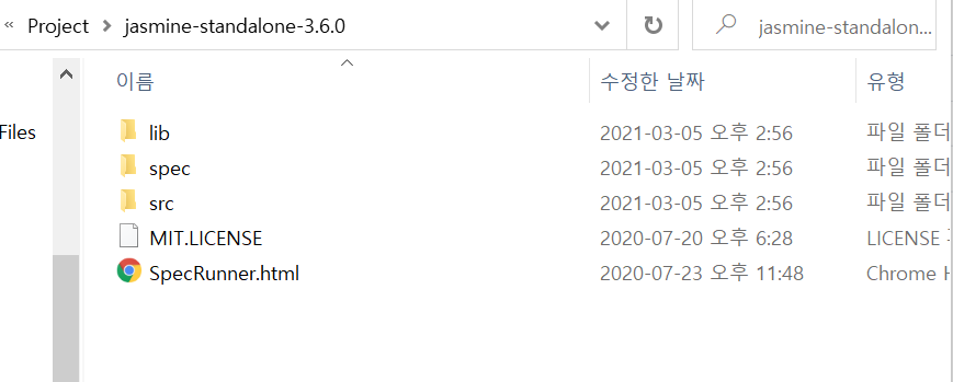 위 사이트에서 가장 최신버전의 jasmine-standalone-(버전).zip 파일을 다운받아 프로젝트 폴더 안에서 압축을 풀어준다