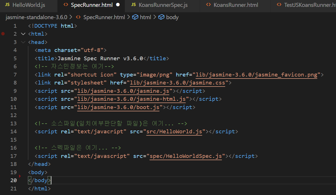 위 두 개의 문서를 참고해서 SpecRunner.html파일을 수정했다.