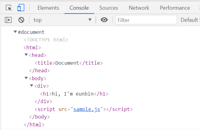 이렇게 html 문서 전체가 콘솔창에 입력된 것을 확인할 수 있다.