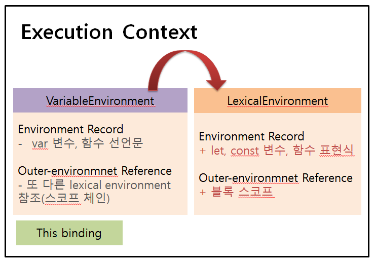 - Environment Record : 현재 컨텍스트의 식별자들에 대한 정보 (ES3의 Variable Object와 비슷한 개념)