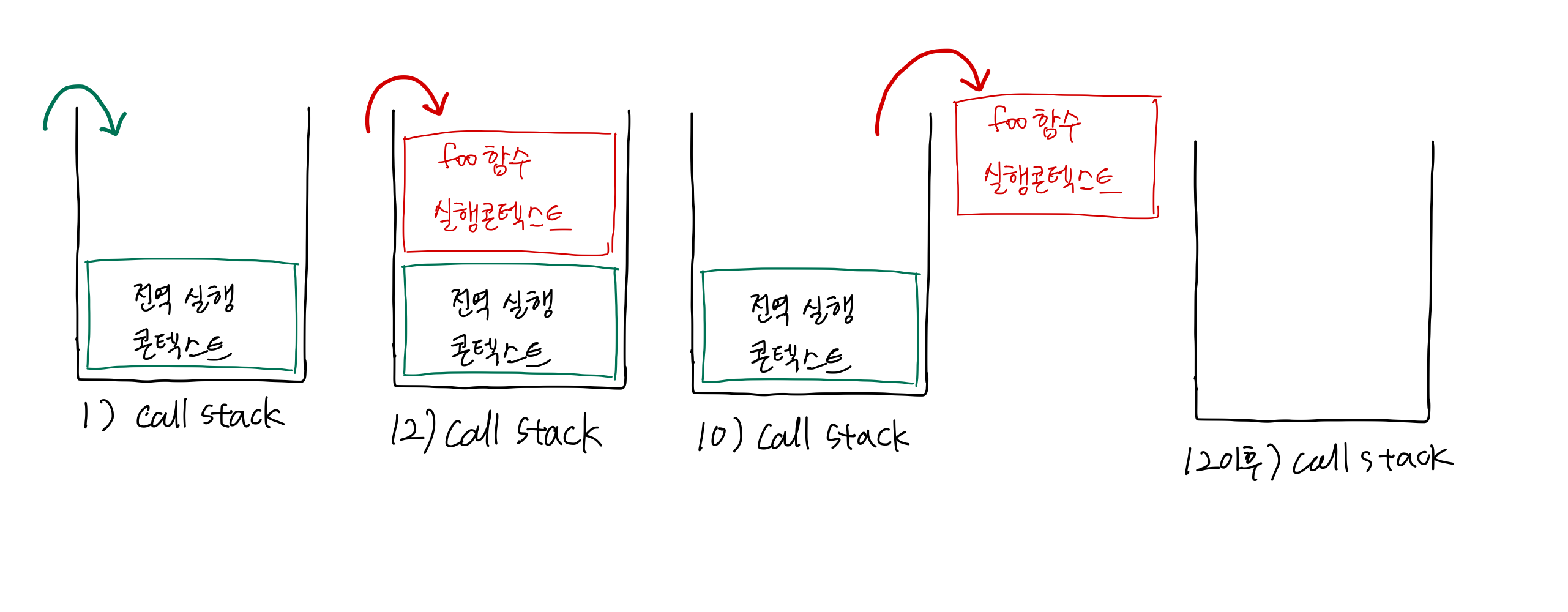 스택 구조의 특성상, 최근에 등록된 foo() 실행콘텍스트가 먼저 실행된다.