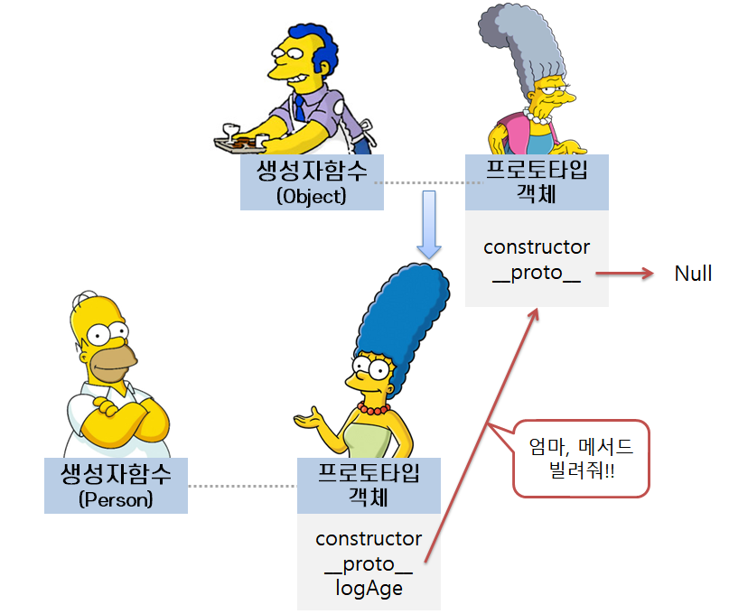 생성자함수 호머심슨이 생성되면 그의 아내 프로토타입 오브젝트인 마지심슨이 그와 연결되어 함께 생성된다.