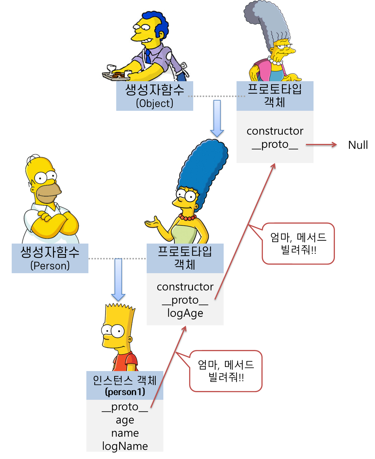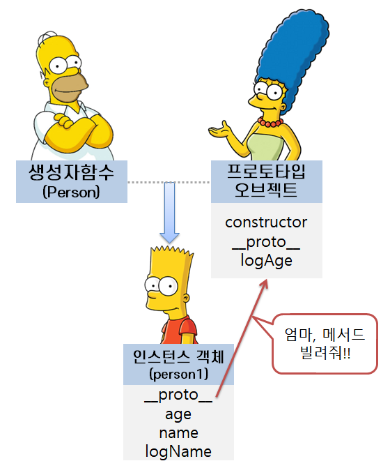 그림을 보면 인스턴스객체인 바트심슨 내부의 __proto__를 통해 엄마 마지심슨에게 메서드를 요청하는 것을 볼 수 있다.