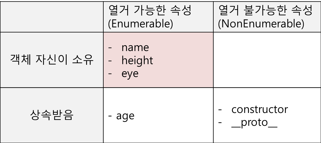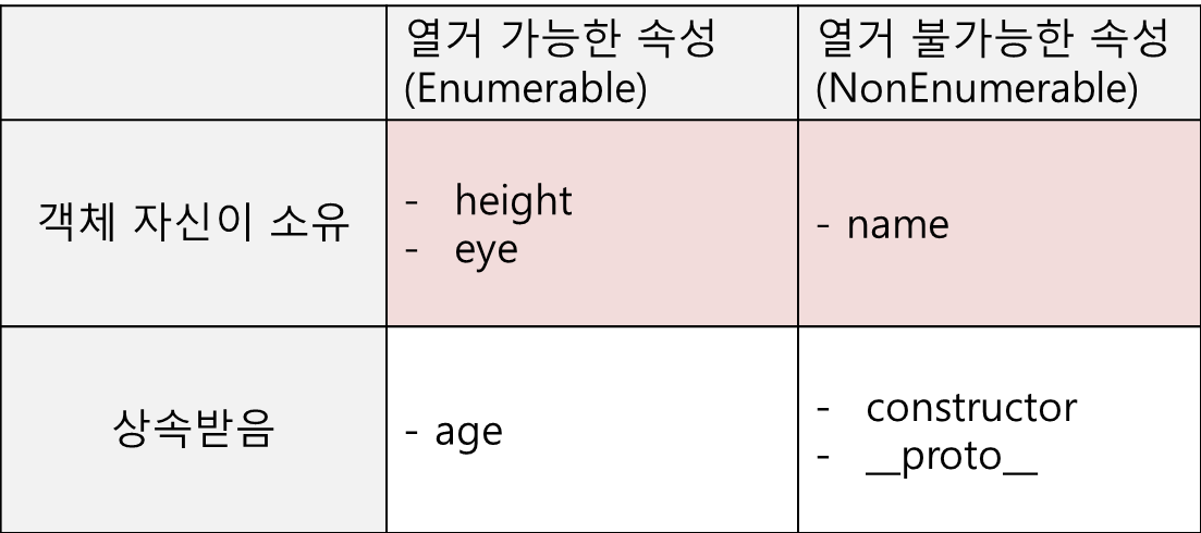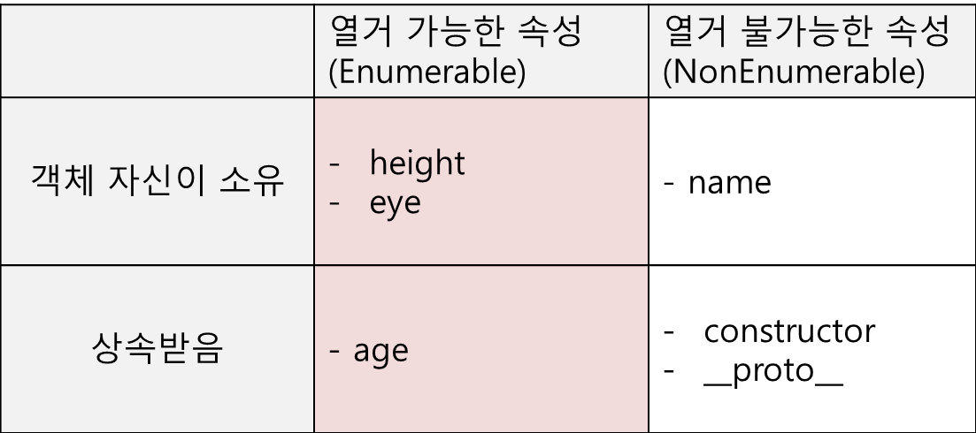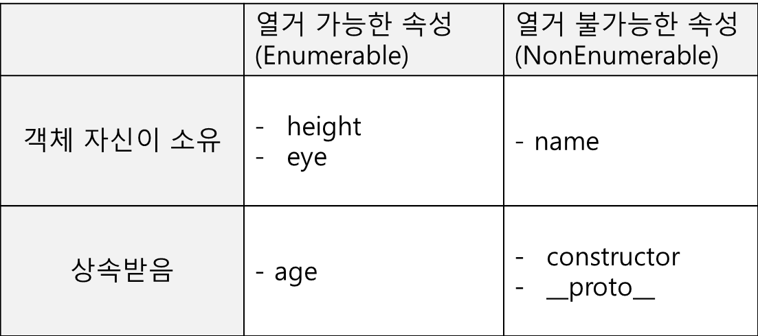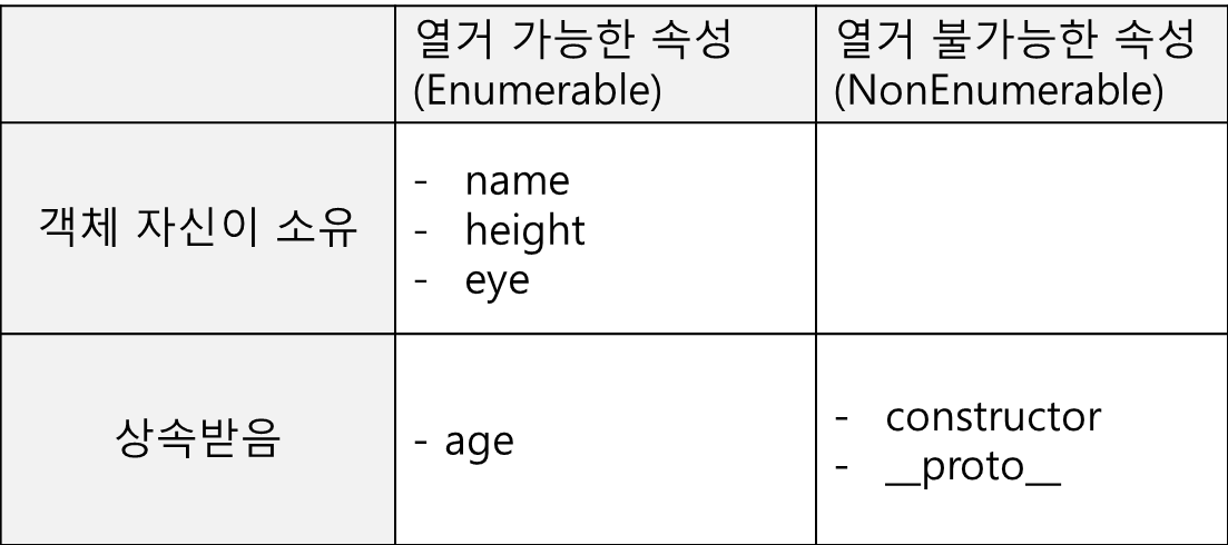 이 중 직접 지정해준 age속성은 열거 가능하지만 그 외의 constructor, __proto__( [[proto]] )속성은 열거 불가능하다.