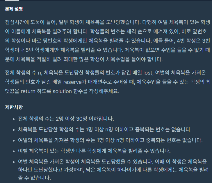 - 여벌의 체육복이 있는데 도난당한 학생의 경우 lost와 reserve 모두에서 제외한다.